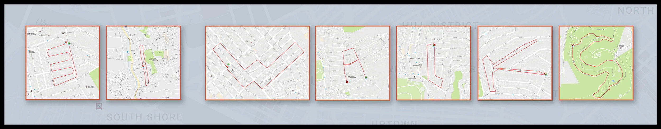 Ultimately settling on creating letters and numbers, to further increase the challenge I imposed a few rules for the project: 1) All characters should orient north to south (ie: no rotating the resulting map).* 2) All walks should be at least one mile. 3) Each character should come from a different neighborhood. 4) Initially I would not allow any editing of the resulting map image, but there were a few instances where I needed to edit, such as when the phone battery died mid walk, or the cell signal failed me, or I tacked extra streets to the walk.