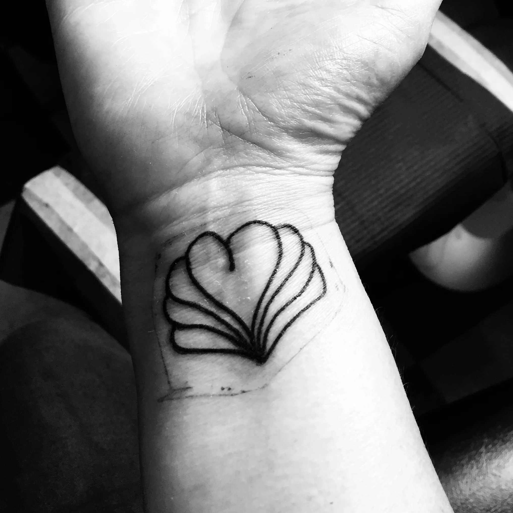 My mom doodles. Walk into her office and invariably you'll find a notepad or an envelope with a handwritten phone number surrounded by a page full of doodles. I have been eying her office space to try to steal away some of those doodles. I've had the idea for some time that I'd get a tattoo of one of her drawings to remember her by so that when she's gone I'll have a part of her with me. Then I realized I could have her create some doodles for me and have her pick out her favorite. And so today, for my birthday, I had one of her hearts tattooed on my wrist.