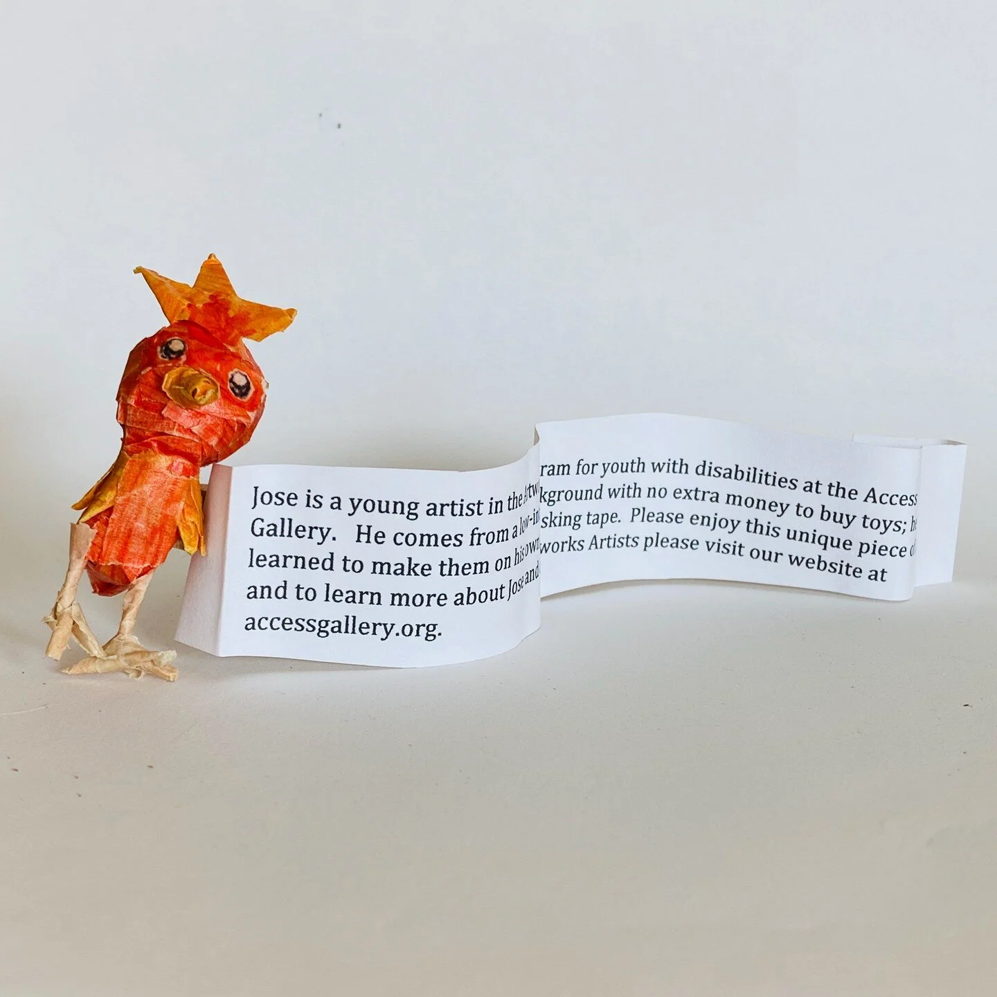 This bird is made from masking tape. The artist is Jose A Chavez who comes from a low-income background with no extra money to buy toys so he learned to make his own using masking tape.